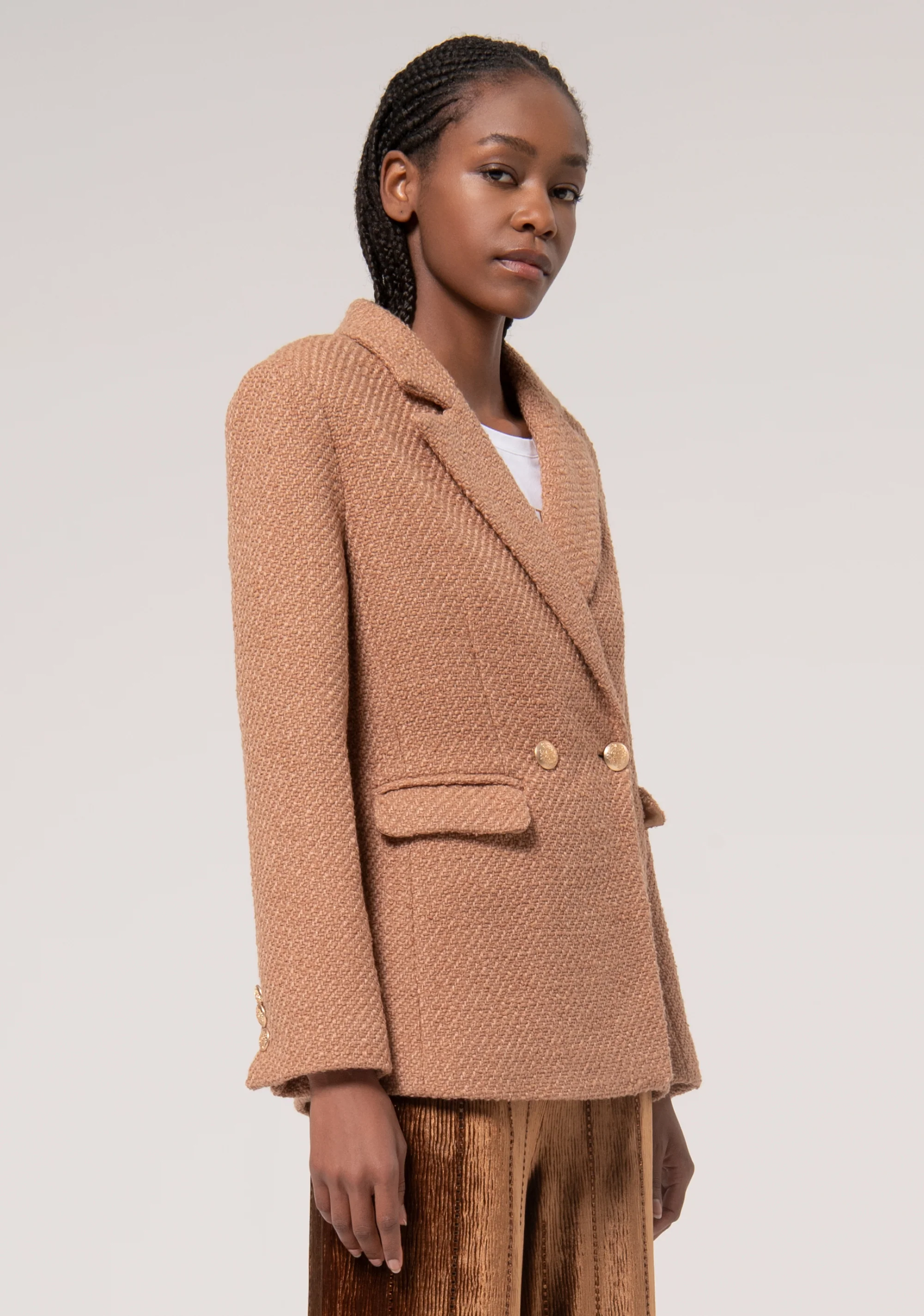Blazer regular lungo in tweed con lana, doppiopetto, revers classico, tasche laterali, e con maniche lunghe.