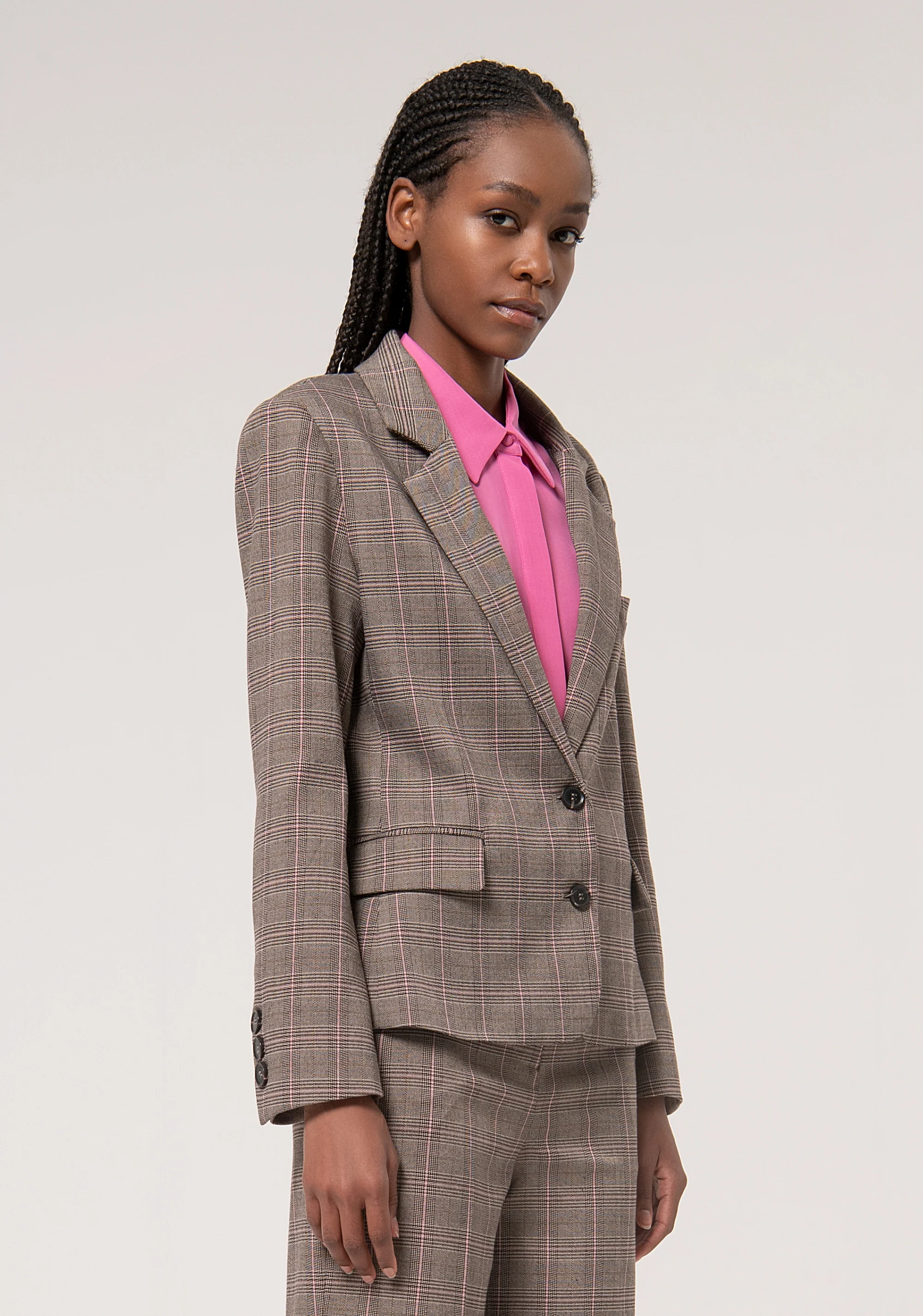 Blazer regular monopetto in tessuto Principe di Galles, revers classico, tasche laterali, e con maniche lunghe.