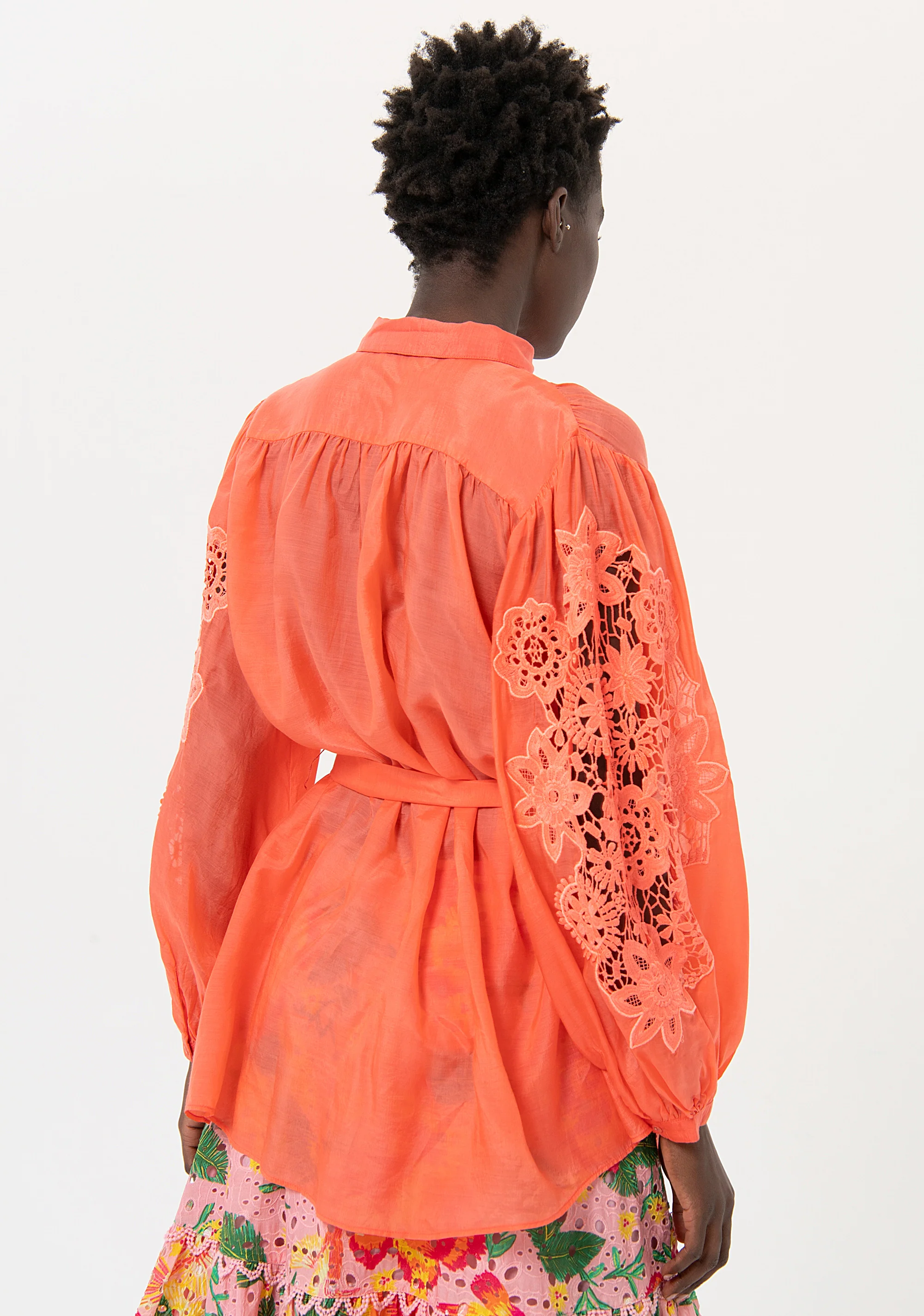 Camicia over in organza, colletto classico, bottoni centrali per apertura, fusciacca in vita, e con maniche lunghe con intarsio in pizzo.