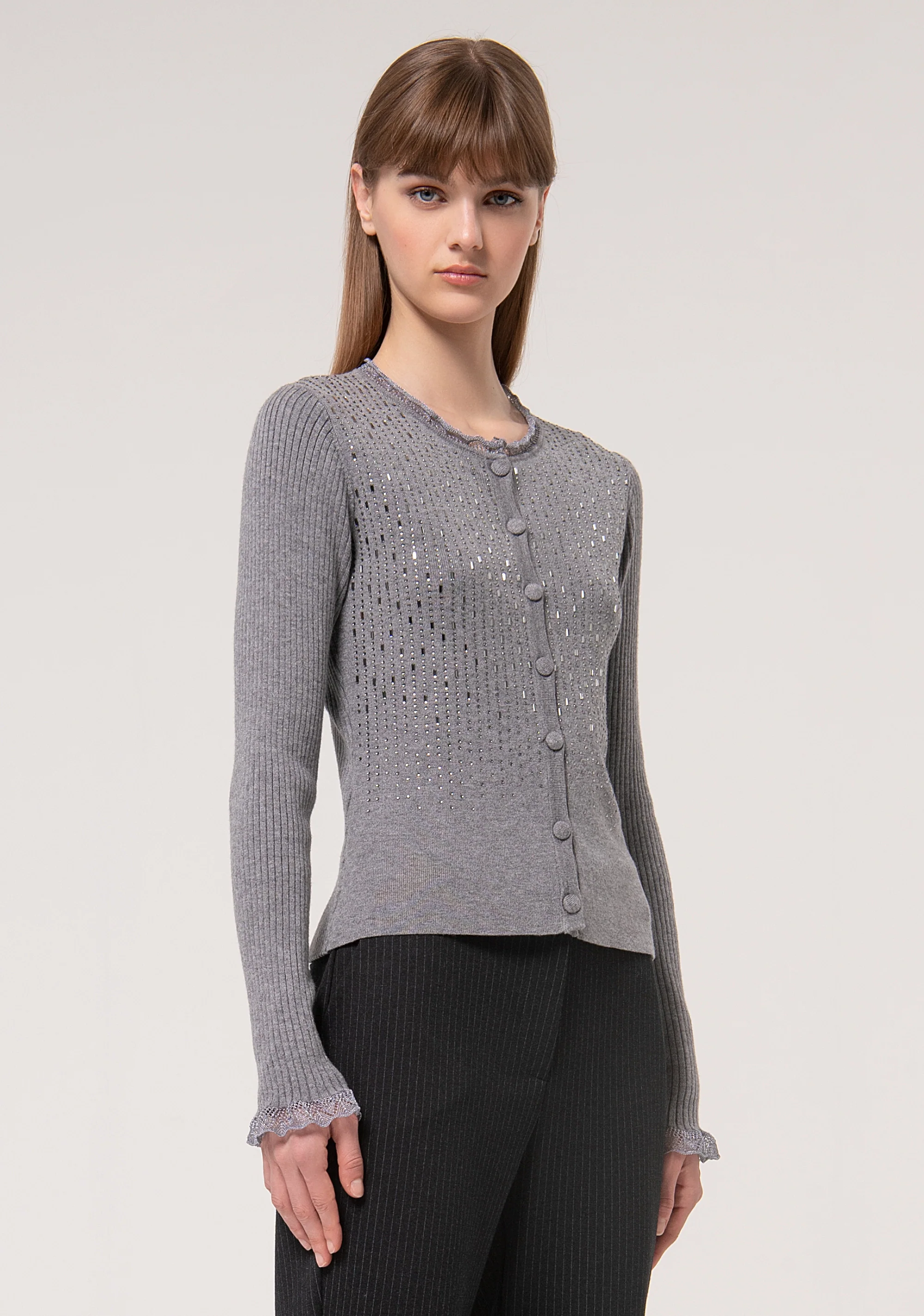 Cardigan slim a costine con strass luminosi, girocollo con rouches applicata, bottoni centrali per apertura, e con maniche lunghe.