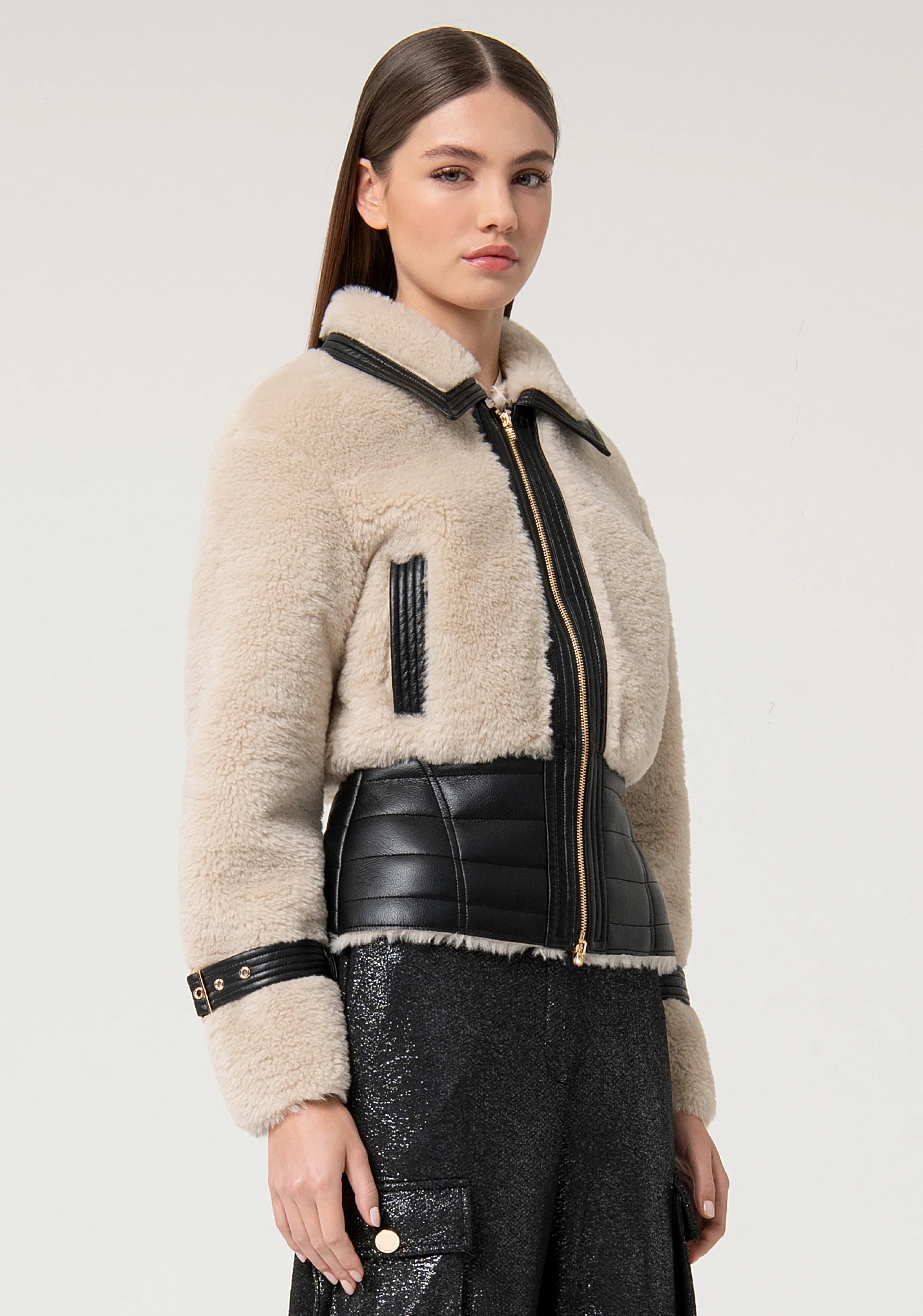 Giacca regular modello aviatore, colletto classico, zip centrale per apertura, tasche laterali, fascia sul fondo in tessuto a contrasto, e con maniche lunghe.