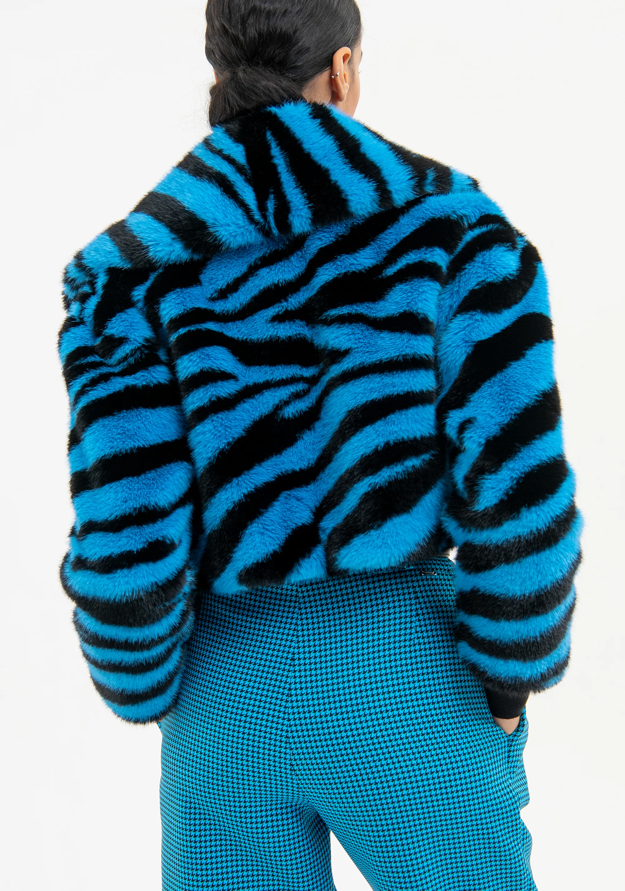 Eco pelliccia cropped in fantasia animalier, revers ampio, apertura centrale, e con maniche lunghe.