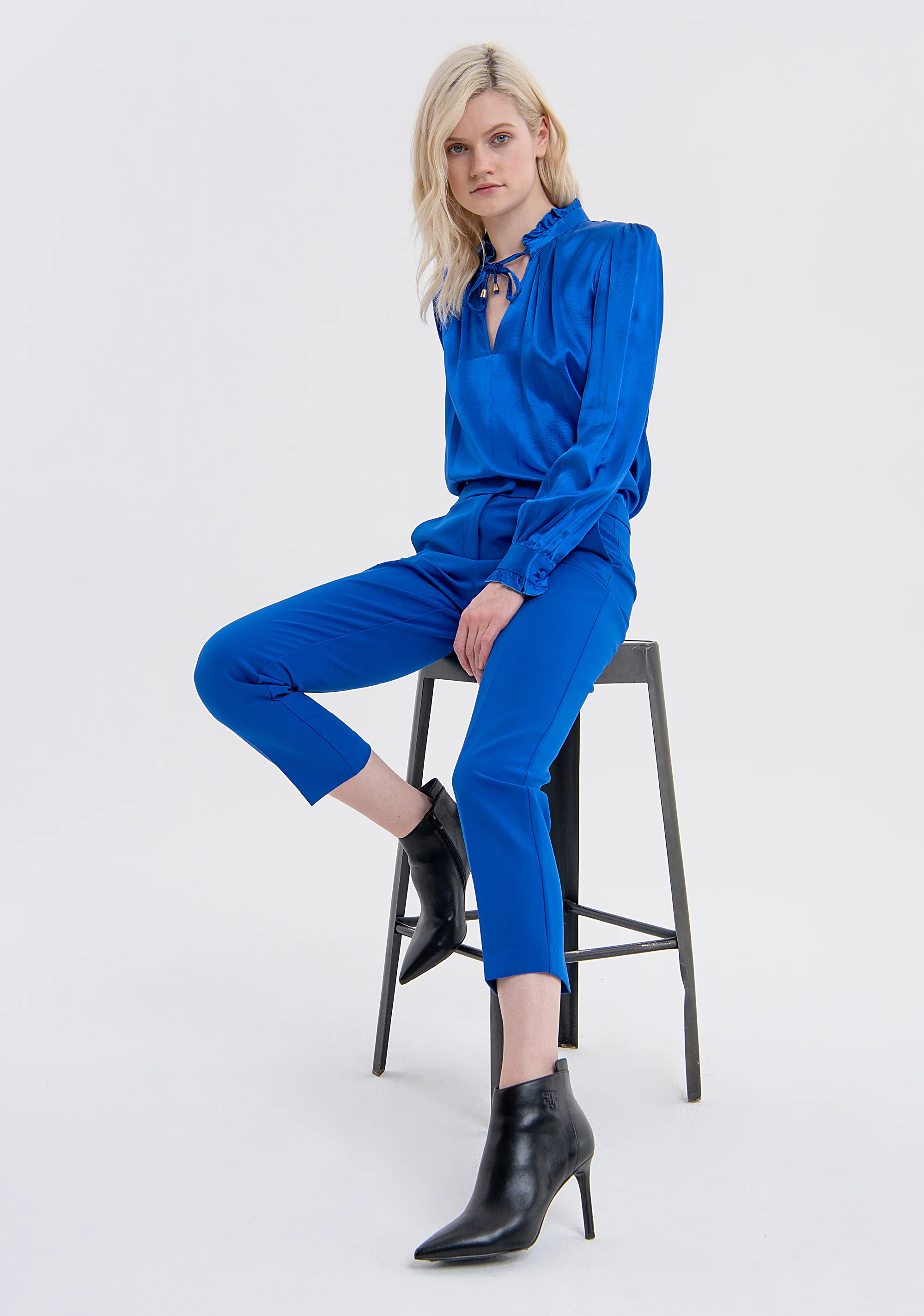 Pantaloni slim in tessuto tecnico, vita regolare, tasche alla francese, e con fondo dritto.