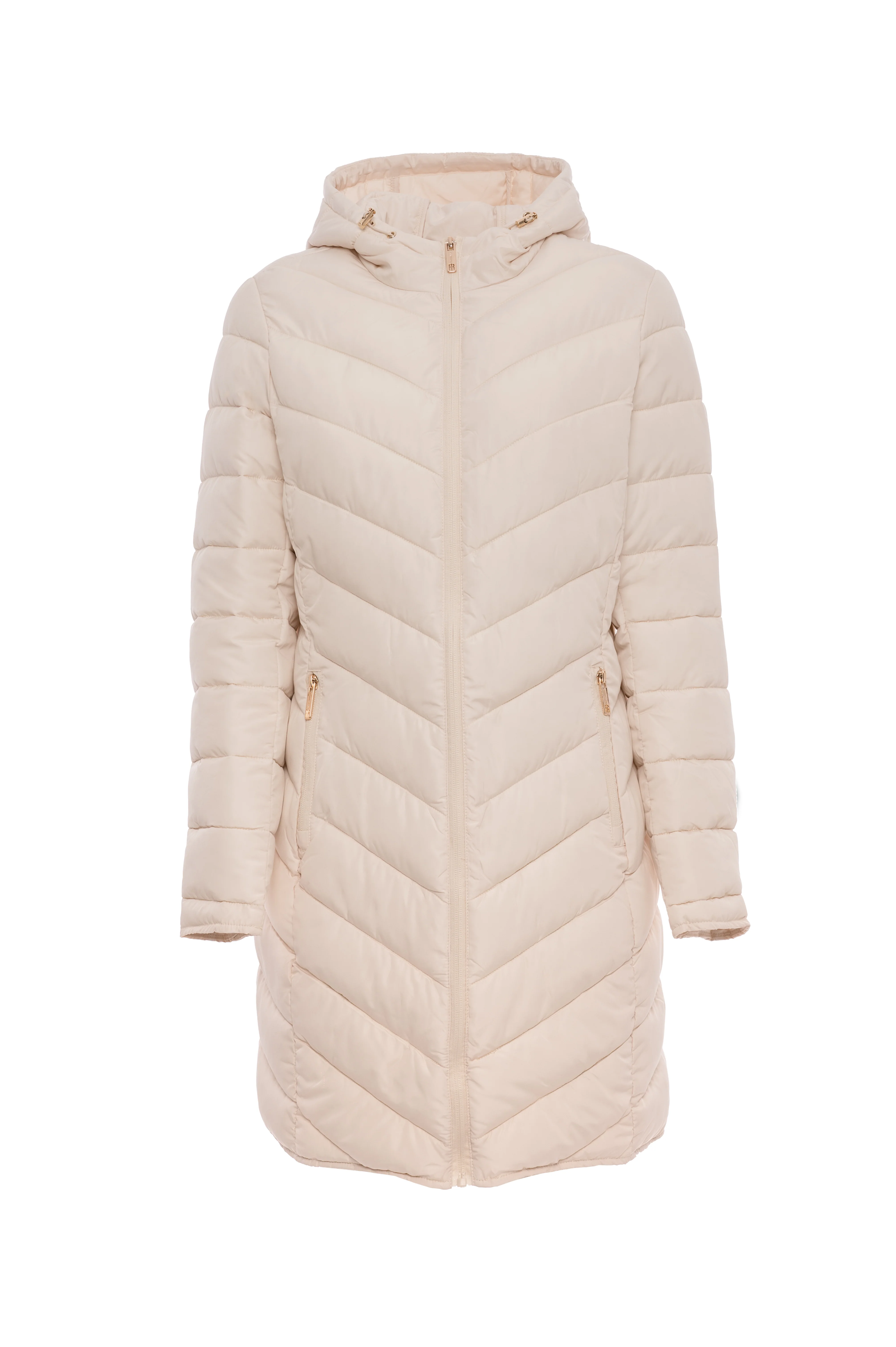Il design presenta una trapuntatura a zig-zag che non solo distribuisce l'imbottitura in modo uniforme per un isolamento ottimale, ma crea anche un motivo visivo dinamico e slanciato. Dotato di un cappuccio fisso e regolabile, offre una protezione extra contro vento e pioggia. La chiusura frontale è una pratica cerniera a doppio cursore, per una maggiore libertà di movimento. Le tasche laterali con zip, impreziosite da dettagli metallici, sono funzionali e sicure. La vestibilità è regolare e confortevole, avvolgendo il corpo senza stringere.