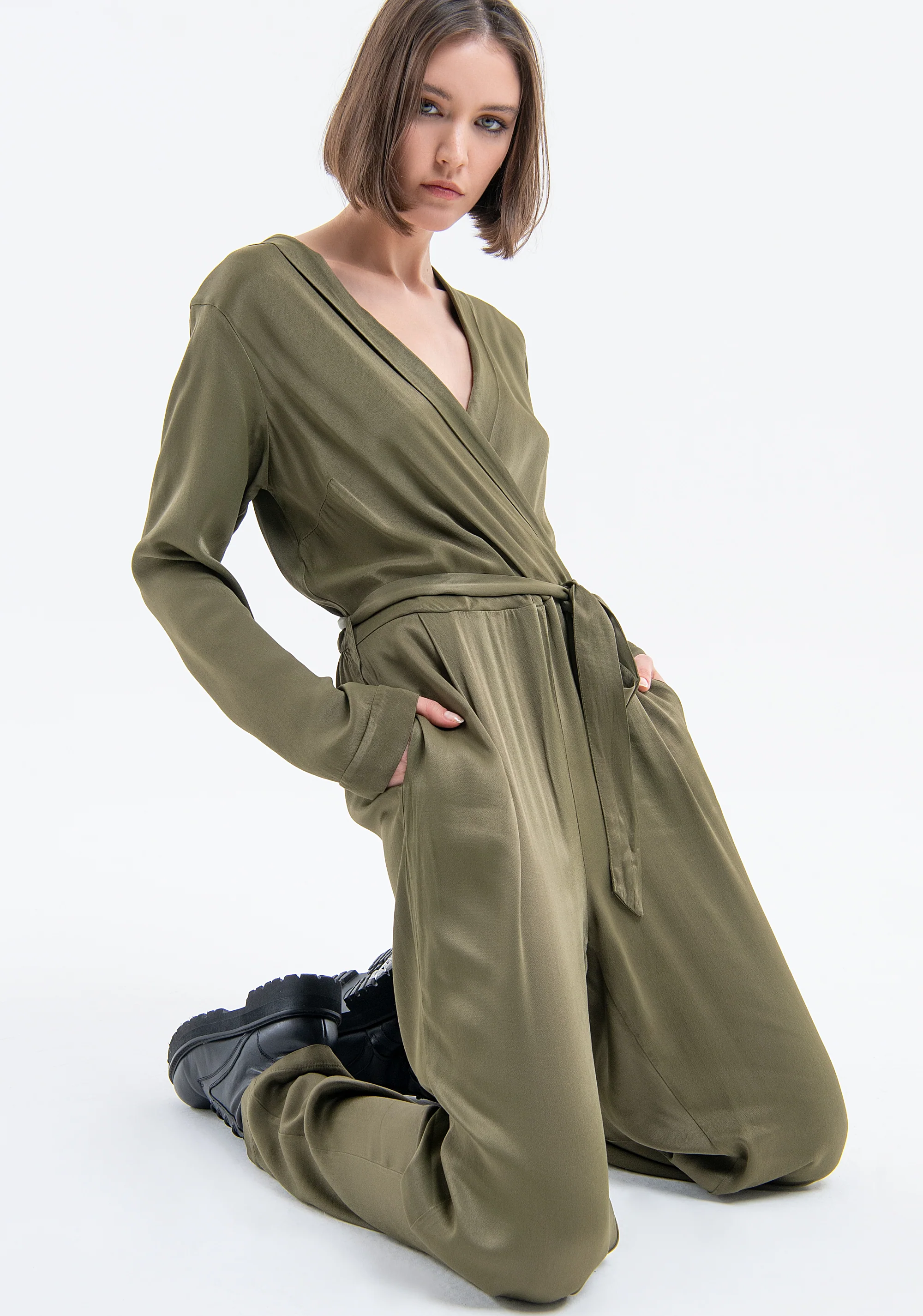 Tuta regular in raso di viscosa, scollo ad incrocio, maniche lunghe, fusciacca in vita, e con pantalone palazzo con tasche laterali.